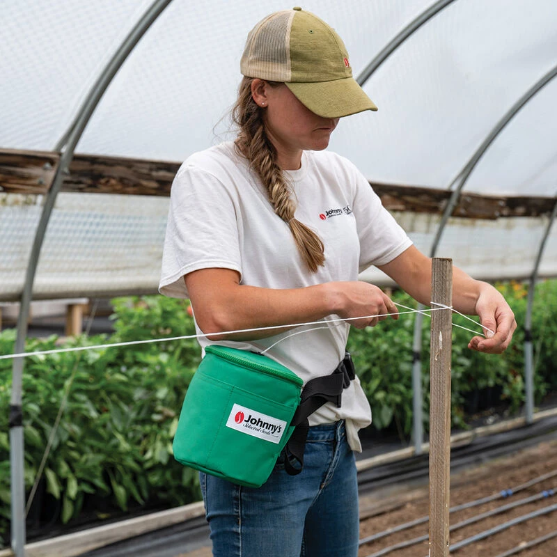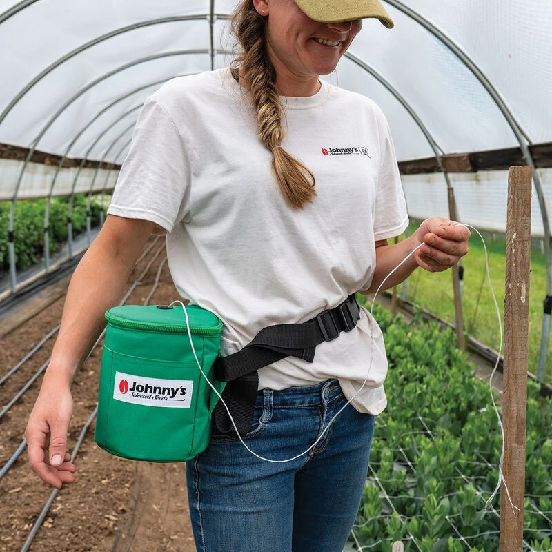 A convenient time-saver for anyone trellising their crops with sisal (9241) or polypropylene (9834 and 9353) twine. Rubber tensioners in the eyelet hold the twine in place and keep it from falling back into the tote during use. Includes an optional adjustable waist belt, belt loops, and (2) 5 1/2″-deep pocket compartments. This padded tote measures a compact 7 3/4″ tall x 7″ diameter.