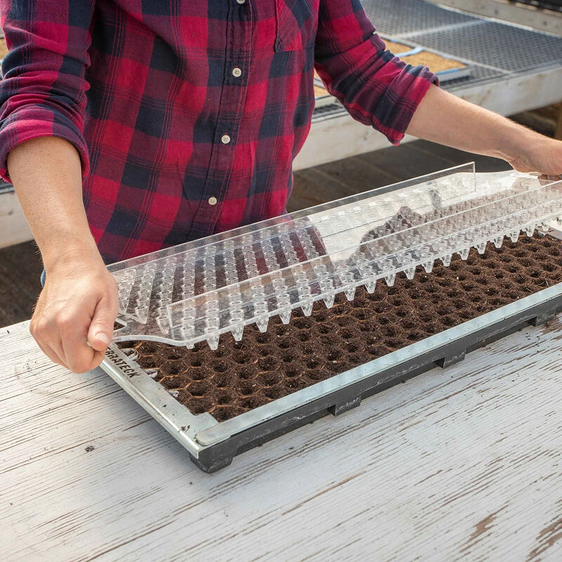 Quickly makes 264 depressions in potting mix to receive seeds. Also helps compress the mix for better performance while transplanting.