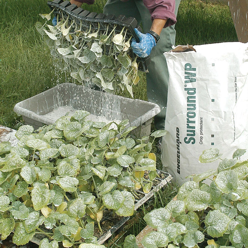 A special formulation of Kaolin clay that forms an effective film barrier, protecting plants from pests by repelling them, causing irritation and confusion, and preventing feeding and egg-laying. Also protects against sun damage and reduces heat stress, cooling plants by 10–15° F. Typical application is by sprayer, but whole trays of seedlings can be dipped for early protection. To avoid post-harvest washing, applications should be made early-season only. Residue may be minimized if applications to smooth skin crops cease when fruit is approximately 1/4 of its expected size. If applied after fruit set, non-toxic white film may be present at harvest, reducing marketability, but can be easily wiped or brushed and washed off with water. Highly recommended for cucumbers, squash, tomatoes, most fruit trees, and grapes. Use 1/4– 1/2 lb./gal. of water; 25–50 lb./100 gal./acre.